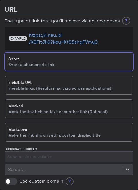 - Short: A short alphanumeric link (12 characters)