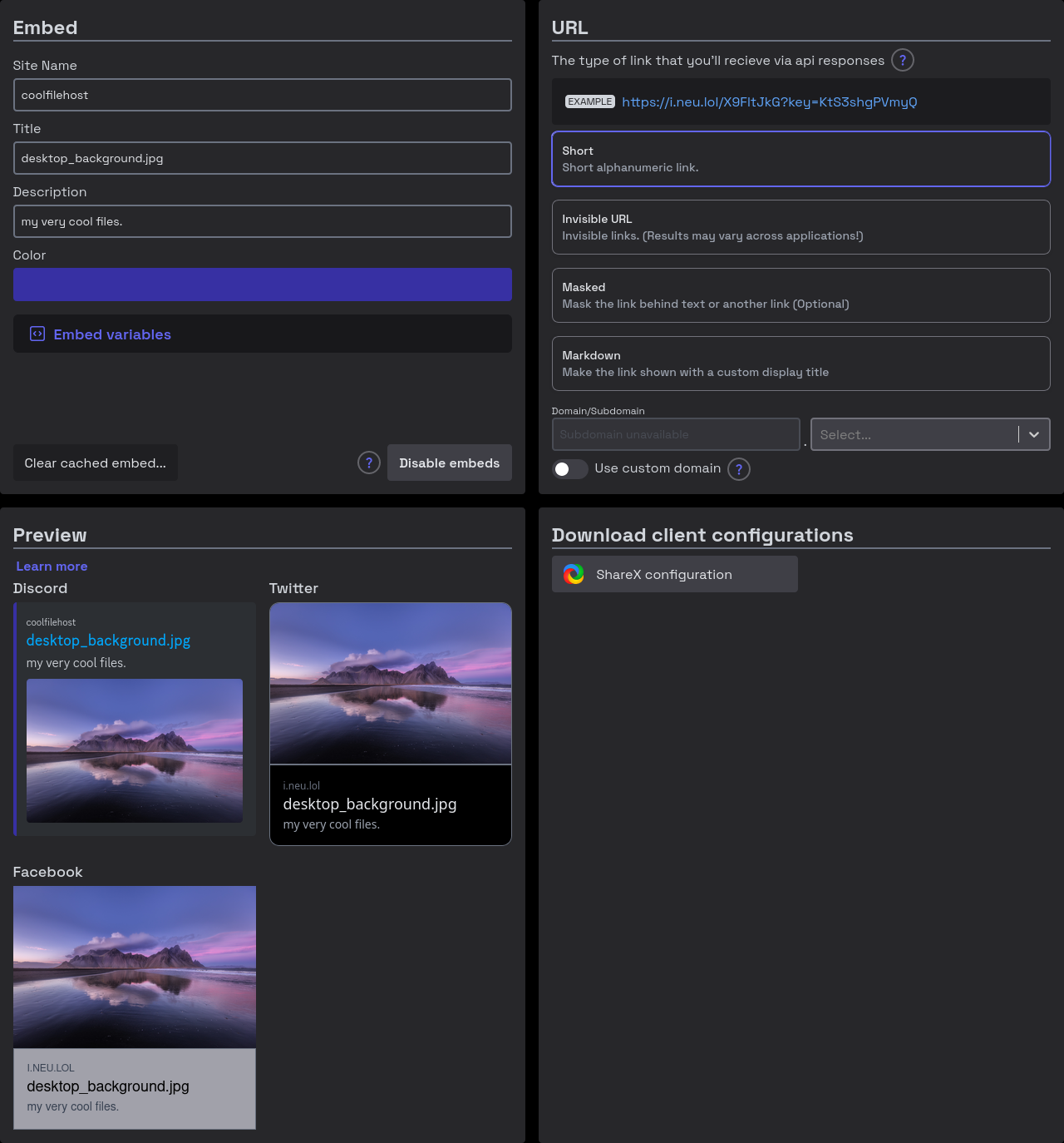 The upload configuration page allows you to set your embed and URL preferences, preview how it looks, and download client configurations.